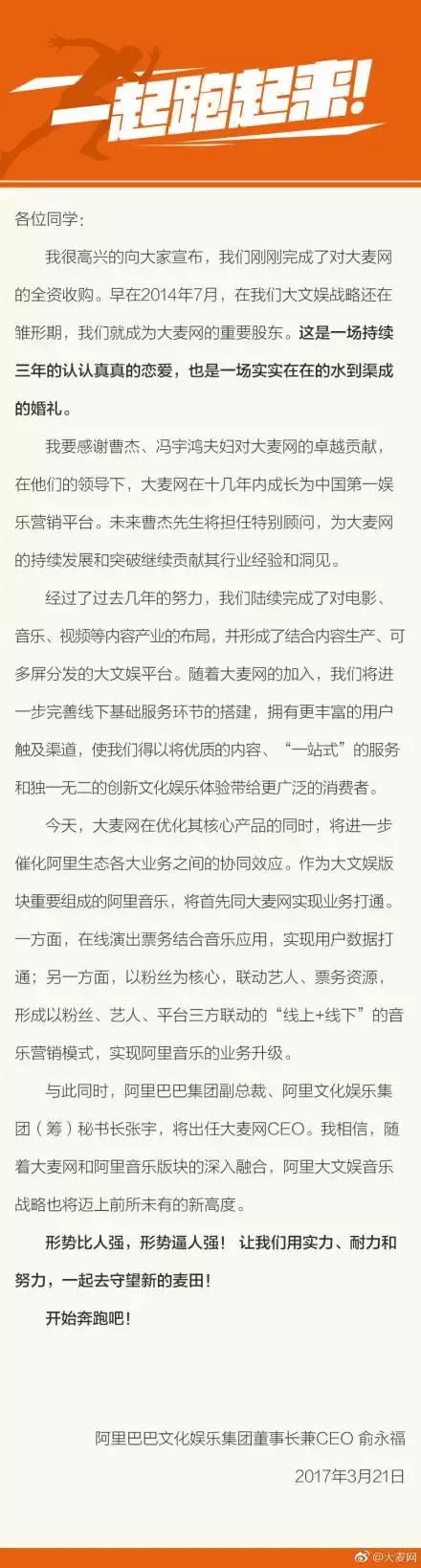 Bianews报道 3月21日消息,阿里巴巴今日宣布于近期完成对大麦网的全资收购,阿里副总裁、阿里文化娱乐集团秘书长张宇出任CEO,创始人曹杰将担任特别顾问。